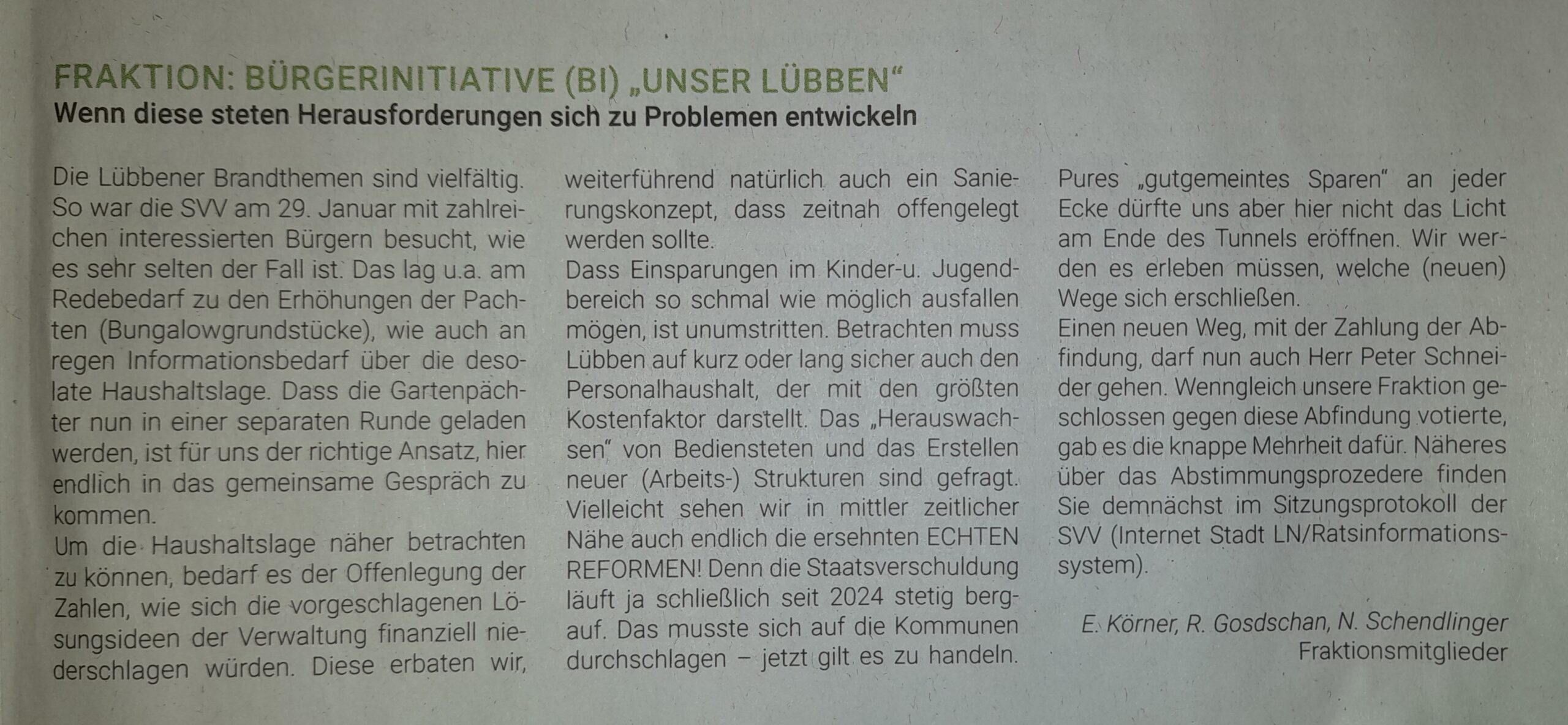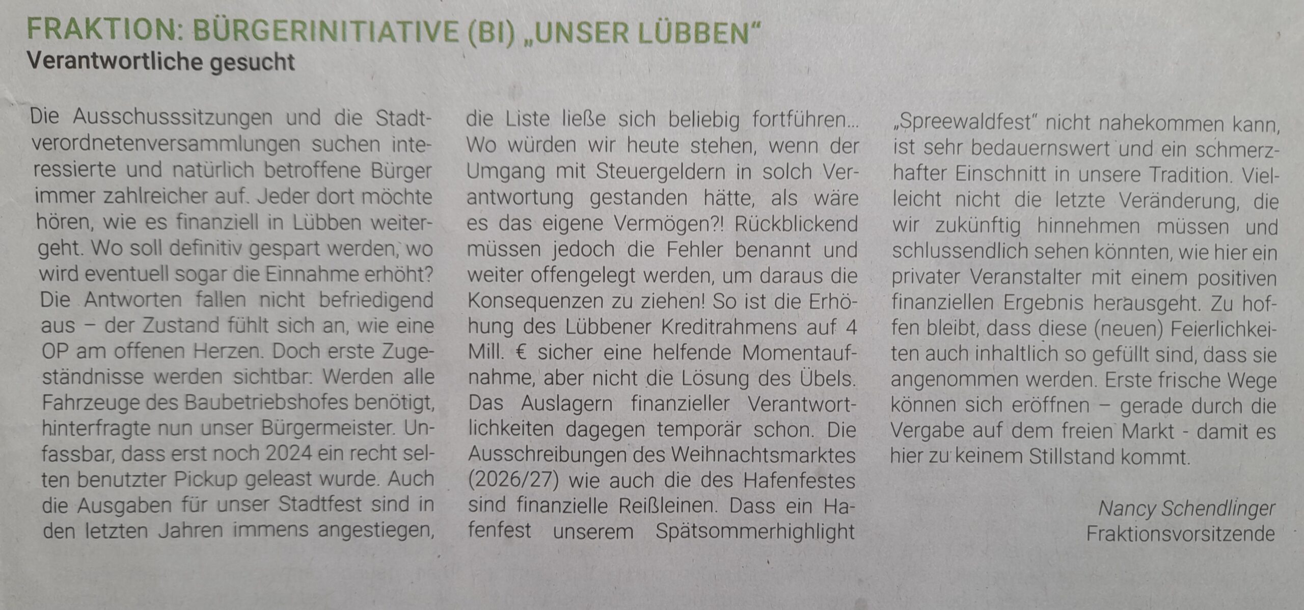 (von der Zeitung abfotografiert – gekürzt) „Früher war sie bei der Flüchtlingshilfe, heute protestiert sie gegen ein Asylbewerberheim“ Ein Interview mit Nancy Schendlinger und Rainer Gosdschan von der Bürgerinitiative „Unser Lübben“.